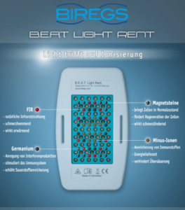 Das B.E.A.T. Light Rent System nutzt gezielte Rot- und Infrarot-Wellenlängen, um natürliche Prozesse des Körpers unterstützend anzusprechen. Es ist nicht nur eine Lichttherapie-Lampe sondern auch noch zusätzlich mit Bioresonanzfrequenzen moduliert. Die präzise Steuerung dieser Form der Lichtintensität ermöglicht eine individuelle Anwendung in Praxen und zu Hause.